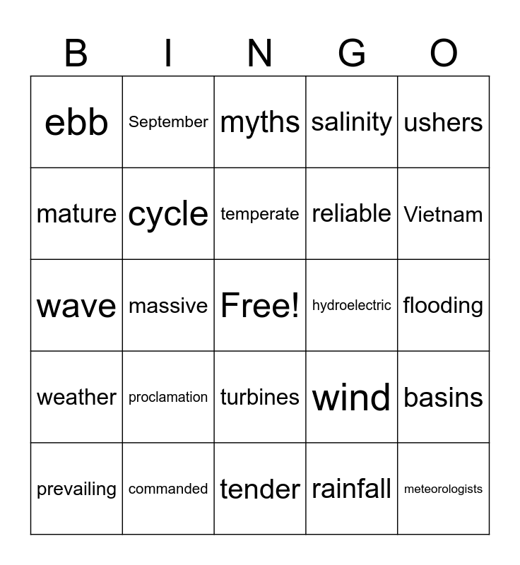 This bingo card has a free space and 24 words: proclamation, commanded, temperate, prevailing, ushers, ebb, mature, September, hydroelectric, turbines, reliable, wave, wind, basins, cycle, rainfall, flooding, myths, Vietnam, massive, meteorologists, weather, salinity and tender.