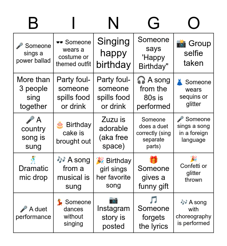 This bingo card has a free space and 29 words: 🎤 A duet performance, Capp doesn't bark when a guest arrives, 🎂 Birthday cake is brought out, 🎶 A Disney song is performed, 🎤 Someone sings a power ballad, Singing happy birthday, Party foul- someone spills food or drink, 🎶 A song from a musical is sung, Someone does a duet correctly (sing separate parts), 💃 Someone dances without singing, 🎤 Someone sings a song in a foreign language, 🎶 A song with choreography is performed, 📷 Instagram story is posted, 🎵 Someone forgets the lyrics, 👗 Someone wears sequins or glitter, 🥳 Someone sings off-key (but with passion!), 🎉 Birthday girl sings her favorite song, 🕺 Dramatic mic drop, 📸 Group selfie taken, 🎤 A country song is sung, 🎁 Someone gives a funny gift, 🎤 Someone sings with sunglasses on, 🎧 A song from the 80s is performed, More than 3 people sing together, Someone says 'Happy Birthday", 🕶️ Someone wears a costume or themed outfit, 🎉 Confetti or glitter thrown, Party foul- someone spills food or drink and 🎶 A song gets the whole crowd singing.