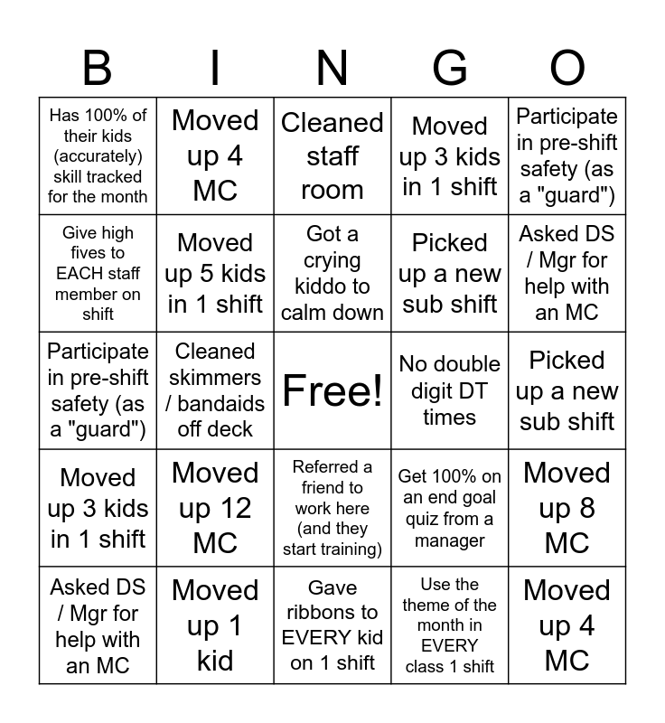 This bingo card has a free space and 24 words: Moved up 12 MC, Moved up 1 kid, Got a crying kiddo to calm down, Asked DS / Mgr for help with an MC, Participate in pre-shift safety (as a "guard"), Has 100% of their kids (accurately) skill tracked for the month, Give high fives to EACH staff member on shift, Moved up 4 MC, No double digit DT times, Referred a friend to work here (and they start training), Picked up a new sub shift, Participate in pre-shift safety (as a "guard"), Get 100% on an end goal quiz from a manager, Moved up 8 MC, Moved up 5 kids in 1 shift, Use the theme of the month in EVERY class 1 shift, Picked up a new sub shift, Cleaned staff room, Asked DS / Mgr for help with an MC, Cleaned skimmers / bandaids off deck, Moved up 4 MC, Moved up 3 kids in 1 shift, Moved up 3 kids in 1 shift and Gave ribbons to EVERY kid on 1 shift.