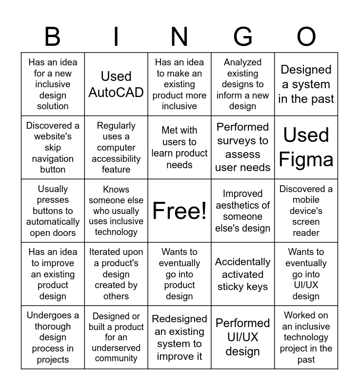 This bingo card has a free space and 24 words: Iterated upon a product's design created by others, Designed or built a product for an underserved community, Met with users to learn product needs, Undergoes a thorough design process in projects, Designed a system in the past, Has an idea for a new inclusive design solution, Discovered a website's skip navigation button, Used AutoCAD, Improved aesthetics of someone else's design, Wants to eventually go into product design, Performed surveys to assess user needs, Usually presses buttons to automatically open doors, Accidentally activated sticky keys, Wants to eventually go into UI/UX design, Regularly uses a computer accessibility feature, Performed UI/UX design, Discovered a mobile device's screen reader, Has an idea to make an existing product more inclusive, Used Figma, Knows someone else who usually uses inclusive technology, Worked on an inclusive technology project in the past, Has an idea to improve an existing product design, Analyzed existing designs to inform a new design and Redesigned an existing system to improve it.
