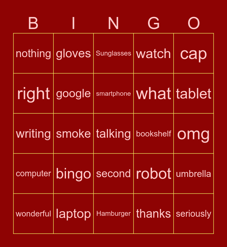 This bingo card has 25 words: bingo, Hamburger, smartphone, wonderful, cap, nothing, right, gloves, bookshelf, second, what, writing, robot, umbrella, google, seriously, omg, Sunglasses, tablet, smoke, talking, laptop, computer, watch and thanks.