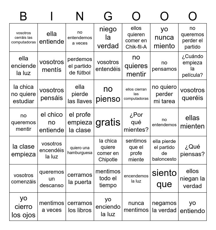 This bingo card has a free space and 48 words: encendemos la luz, no pensamos, yo enciendo la luz, el chico no entiende, ella pierde las llaves, ellas mienten, ella entiende, mentimos a veces, yo nunca miento, la chica quiere comer en Chipotle, no queremos perder el partido, niego la verdad, no quiero perder mi tarea, ellos cierran las computadoras, vosotros comenzáis, no entendemos, ella enciende la luz, ¿Cuándo empieza la película?, siento que, ellos quieren comer en Chik-fil-A, no quieres mentir, el profe empieza la clase, vosotros cerráis las computadoras, vosotros mentís, ellos niegan la verdad, perdemos el partido de fútbol, vosotros queréis, yo cierro los ojos, no pienso, vosotros pensáis, negamos la verdad, ¿Por qué mientes?, ¿Qué piensas?, queremos un descanso, no queremos mentir, sentimos que el profe miente, ella pierde el partido de baloncesto, la chica no quiere estudiar, quiero una hamburguesa, cerramos la puerta, la clase empieza, yo entiendo, no entendemos a veces, cerramos los libros, vosotros entendéis, mentimos todo el tiempo, vosotros encendéis la luz and nunca mentimos.