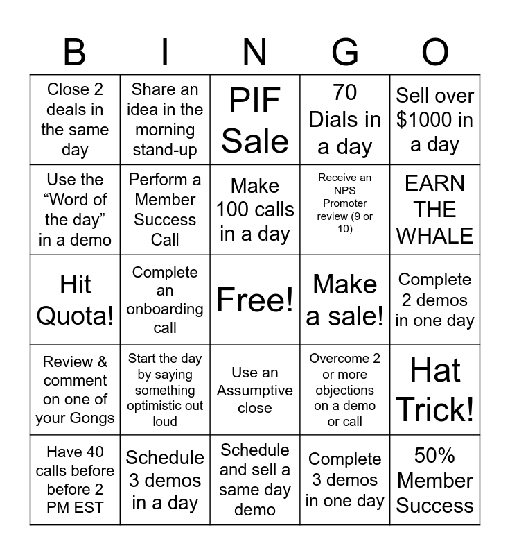 This bingo card has a free space and 24 words: Start the day by saying something optimistic out loud, Schedule 3 demos in a day, Make 100 calls in a day, Have 40 calls before before 2 PM EST, Sell over $1000 in a day, Close 2 deals in the same day, Use the “Word of the day” in a demo, Share an idea in the morning stand-up, Make a sale!, Use an Assumptive close, Receive an NPS Promoter review (9 or 10), Hit Quota!, Overcome 2 or more objections on a demo or call, Hat Trick!, Perform a Member Success Call, Complete 3 demos in one day, Complete 2 demos in one day, PIF Sale, EARN THE WHALE, Complete an onboarding call, 50% Member Success, Review & comment on one of your Gongs, 70 Dials in a day and Schedule and sell a same day demo.