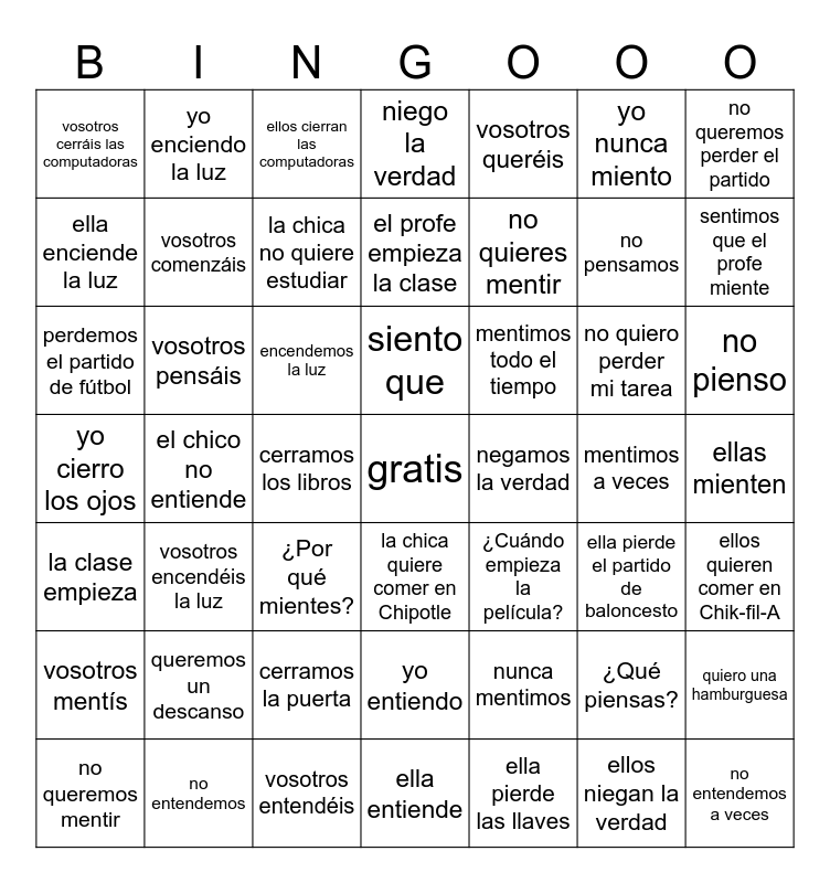 This bingo card has a free space and 48 words: nunca mentimos, no pensamos, ella entiende, el chico no entiende, encendemos la luz, ellas mienten, yo enciendo la luz, no entendemos, yo nunca miento, la chica quiere comer en Chipotle, no queremos perder el partido, niego la verdad, no quiero perder mi tarea, mentimos todo el tiempo, vosotros mentís, mentimos a veces, ella enciende la luz, sentimos que el profe miente, ¿Qué piensas?, vosotros queréis, no quieres mentir, cerramos los libros, vosotros cerráis las computadoras, vosotros comenzáis, quiero una hamburguesa, la chica no quiere estudiar, no pienso, no queremos mentir, siento que, vosotros pensáis, ellos niegan la verdad, negamos la verdad, ellos quieren comer en Chik-fil-A, queremos un descanso, yo cierro los ojos, ¿Cuándo empieza la película?, ella pierde el partido de baloncesto, perdemos el partido de fútbol, ¿Por qué mientes?, cerramos la puerta, la clase empieza, no entendemos a veces, ellos cierran las computadoras, vosotros entendéis, el profe empieza la clase, yo entiendo, vosotros encendéis la luz and ella pierde las llaves.