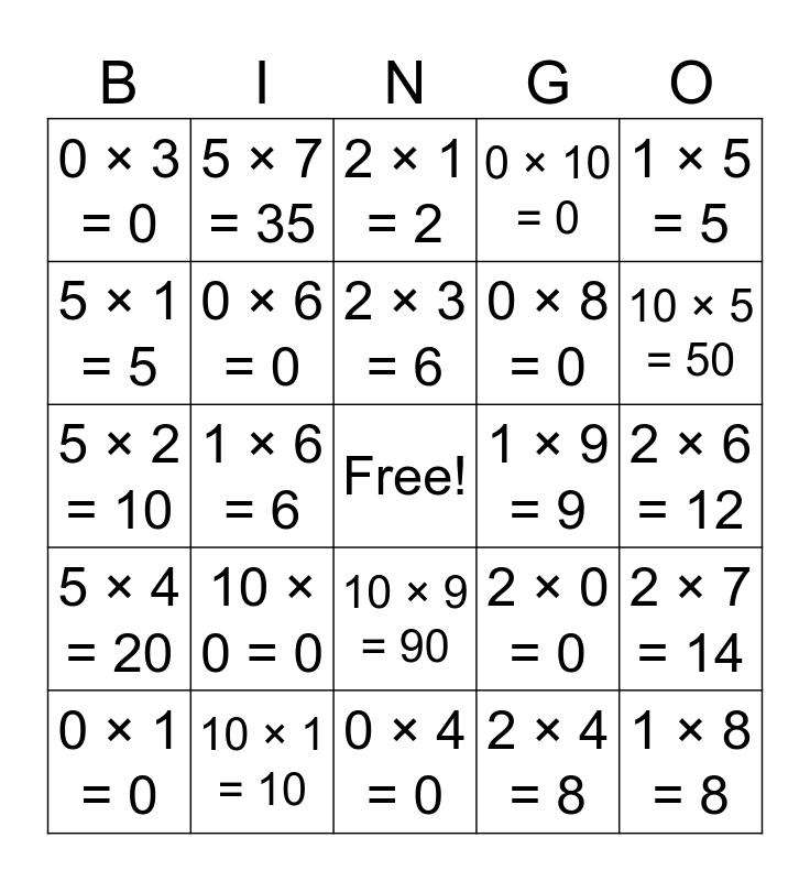 This bingo card has a free space and 55 words: 0 × 0 = 0, 0 × 1 = 0, 0 × 2 = 0, 0 × 3 = 0, 0 × 4 = 0, 0 × 5 = 0, 0 × 6 = 0, 0 × 7 = 0, 0 × 8 = 0, 0 × 9 = 0, 0 × 10 = 0, 1 × 0 = 0, 1 × 1 = 1, 1 × 2 = 2, 1 × 3 = 3, 1 × 4 = 4, 1 × 5 = 5, 1 × 6 = 6, 1 × 7 = 7, 1 × 8 = 8, 1 × 9 = 9, 1 × 10 = 10, 2 × 0 = 0, 2 × 1 = 2, 2 × 2 = 4, 2 × 3 = 6, 2 × 4 = 8, 2 × 5 = 10, 2 × 6 = 12, 2 × 7 = 14, 2 × 8 = 16, 2 × 9 = 18, 2 × 10 = 20, 5 × 0 = 0, 5 × 1 = 5, 5 × 2 = 10, 5 × 3 = 15, 5 × 4 = 20, 5 × 5 = 25, 5 × 6 = 30, 5 × 7 = 35, 5 × 8 = 40, 5 × 9 = 45, 5 × 10 = 50, 10 × 0 = 0, 10 × 1 = 10, 10 × 2 = 20, 10 × 3 = 30, 10 × 4 = 40, 10 × 5 = 50, 10 × 6 = 60, 10 × 7 = 70, 10 × 8 = 80, 10 × 9 = 90 and 10 × 10 = 100.