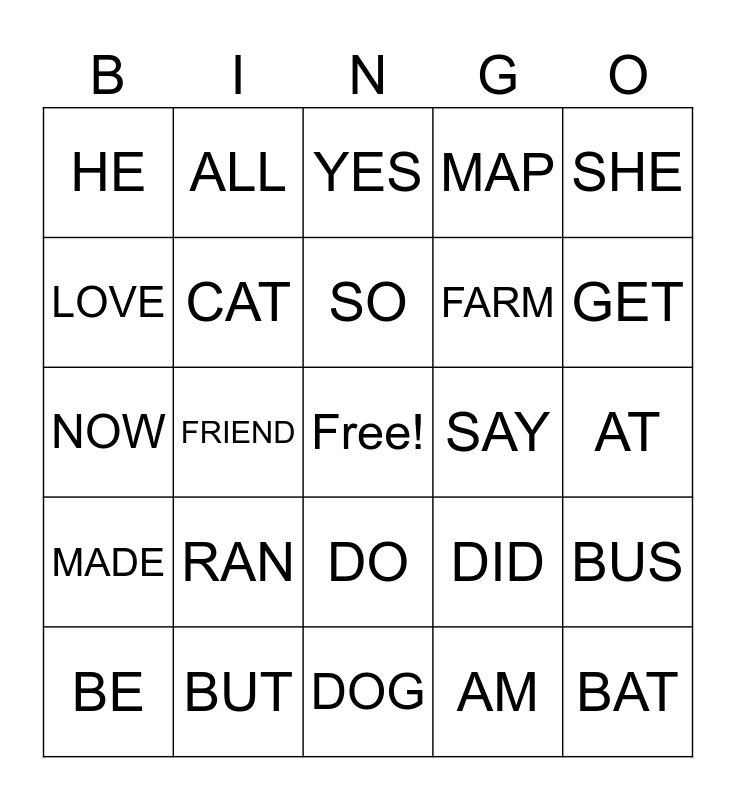 This bingo card has a free space and 24 words: BE, RAN, SO, AM, SHE, HE, ALL, YES, SAY, AT, NOW, CAT, DID, BUS, LOVE, BUT, DOG, MAP, GET, MADE, FRIEND, DO, FARM and BAT.