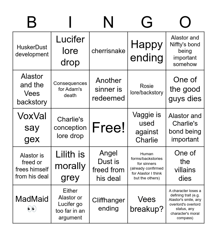 This bingo card has a free space and 24 words: Lilith is morally grey, Either Alastor or Lucifer go too far in an argument, Another sinner is redeemed, MadMaid 👀, Alastor and Niffty's bond being important somehow, HuskerDust development, Alastor and the Vees backstory, Lucifer lore drop, Vaggie is used against Charlie, Angel Dust is freed from his deal, Rosie lore/backstory, VoxVal say gex, Human forms/backstories for sinners (already confirmed for Alastor I think but the others), One of the villains dies, Consequences for Adam's death, Vees breakup?, Alastor and Charlie's bond being important, cherrisnake, One of the good guys dies, Charlie's conception lore drop, A character loses a defining trait (e.g. Alastor's smile, any overlord's overlord status, any character's moral compass), Alastor is freed or frees himself from his deal, Happy ending and Cliffhanger ending.
