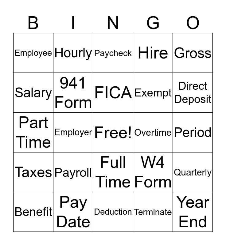 This bingo card has a free space and 25 words: Payroll, Deduction, FICA, Benefit, Gross, Employee, Salary, Hourly, Overtime, Full Time, Exempt, Part Time, W4 Form, Quarterly, 941 Form, Bi-Weekly, Period, Paycheck, Direct Deposit, Employer, Year End, Pay Date, Taxes, Hire and Terminate.