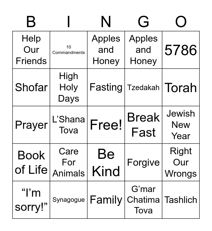 ⚠ This card has duplicate items: Care For Animals (2), Apples and Honey (2), Torah (2)