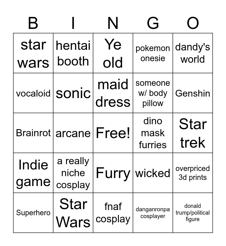 This bingo card has a free space and 49 words: hazbin hotel/helluva boss cosplay, donald trump/political figure, fat greasy middle aged discord mod with a neckbeard, fnaf cosplay, a really niche cosplay, my little pony, hentai booth, genshin impact cosplay, vocaloid, tumblr sexymen, sonic, pokemon onesie, overpriced 3d prints, wicked, ddlc, furries, maid dress, dino mask furries, overpriced prints that they probably didnt even make themselves, dandy's world, arcane, danganronpa cosplayer, star wars, someone w/ body pillow, Hazbin /helluva, Genshin, Superhero, Among us, Furry, Indie game, Anime, Disney, Kpop demon hunters, Giant weapon, Star Wars, Pokemon, Free, Horror movie, Star trek, Nintendo, Knight, Mario, My little pony, Dr who, Brainrot, Ye old, Sparkles, Minecraft and One piece.