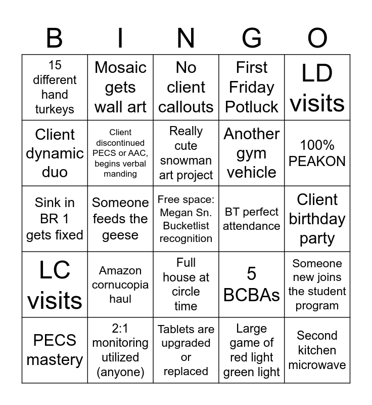 This bingo card has a free space and 39 words: New BT onboarded, Client’s first pee in potty, LD baby pictures, Client discontinued PECS or AAC, begins verbal manding, PECS mastery, Full house at circle time, Really cute snowman art project, No accident clean ups for 1 day, LD visits, LC visits, Someone feeds the geese, First Friday Potluck, Second kitchen microwave, Client birthday party, BT perfect attendance, Amazon cornucopia haul, Dance party!, 15 different hand turkeys, Trick or treating, 5 BCBAs, Client dynamic duo, Tablets are upgraded or replaced, Another gym vehicle, 100% PEAKON, Client unexpected pairing, 5 new clients!, Client in underwear, Behavior reduction mastery, Catch and release spider, Mosaic gets wall art, Office-wide competition tie, Baby comes to visit, No client callouts, 2:1 monitoring utilized (anyone), Large game of red light green light, Cute or weird animal outside the window distracts everyone, Someone new joins the student program, Sink in BR 1 gets fixed and Maintenance employees make friends with a client.
