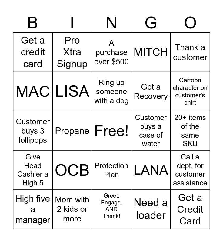 This bingo card has a free space and 29 words: Customer only buys a snack and drink, Mom with 2 kids or more, A purchase over $500, Call for manager approval, Thank a customer, Get a credit card, LISA, Ring up someone with a dog, Customer buys a case of water, Call a dept. for customer assistance, High five a manager, Propane, Need a loader, Get a Credit Card, Customer buys 3 lollipops, HAM, Greet, Engage, AND Thank!, LANA, Cartoon character on customer's shirt, Give Head Cashier a High 5, OCB, Customer uses cash to pay, Get a Recovery, 20+ items of the same SKU, MAC, Pro Xtra Signup, Protection Plan, MITCH and Military Discount.