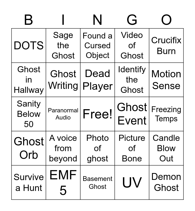 This bingo card has a free space and 24 words: A voice from beyond, EMF 5, Dead Player, Survive a Hunt, Crucifix Burn, DOTS, Ghost in Hallway, Sage the Ghost, Ghost Event, Photo of ghost, Identify the Ghost, Sanity Below 50, Picture of Bone, Candle Blow Out, Ghost Writing, UV, Freezing Temps, Found a Cursed Object, Motion Sense, Paranormal Audio, Demon Ghost, Ghost Orb, Video of Ghost and Basement Ghost.