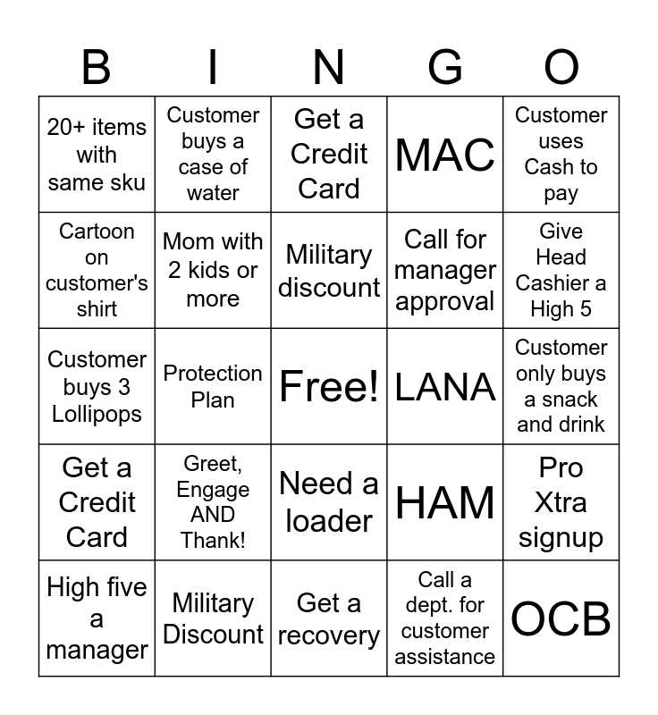 This bingo card has a free space and 29 words: High five a manager, Propane, Protection Plan, MITCH, 20+ items with same sku, Get a Credit Card, Mom with 2 kids or more, Greet, Engage AND Thank!, LANA, Military Discount, Customer only buys a snack and drink, OCB, Get a recovery, Call a dept. for customer assistance, Give Head Cashier a High 5, LISA, Need a loader, Get a Credit Card, Customer uses Cash to pay, Customer buys 3 Lollipops, HAM, Ring up someone with a dog, Call for manager approval, Cartoon on customer's shirt, MAC, Customer buys a case of water, Pro Xtra signup, Military discount and Get a recovery.