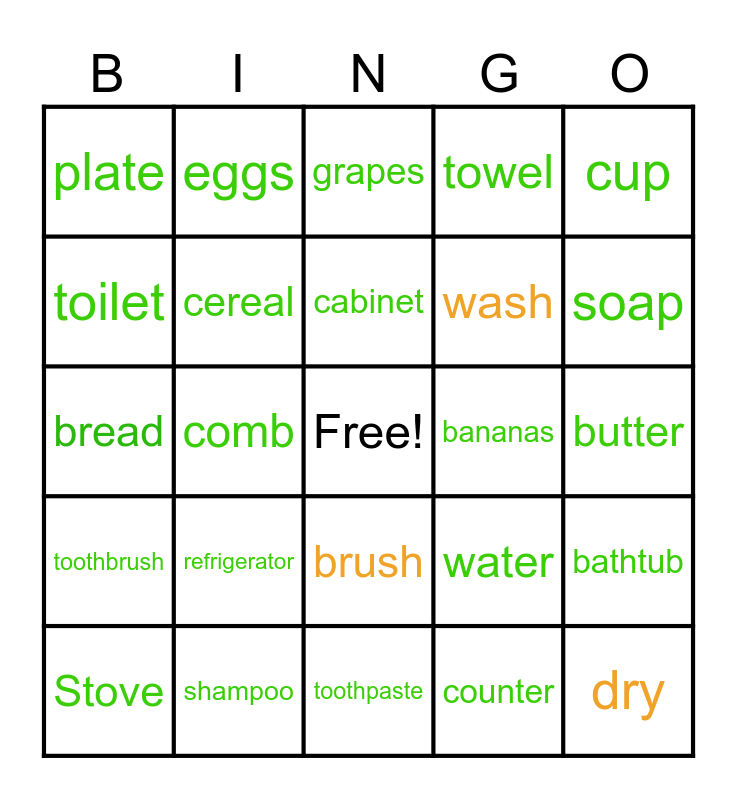 This bingo card has a free space and 24 words: Stove, refrigerator, cabinet, counter, cup, plate, eggs, grapes, bananas, butter, bread, cereal, water, bathtub, toilet, shampoo, toothpaste, towel, soap, toothbrush, comb, brush, wash and dry.