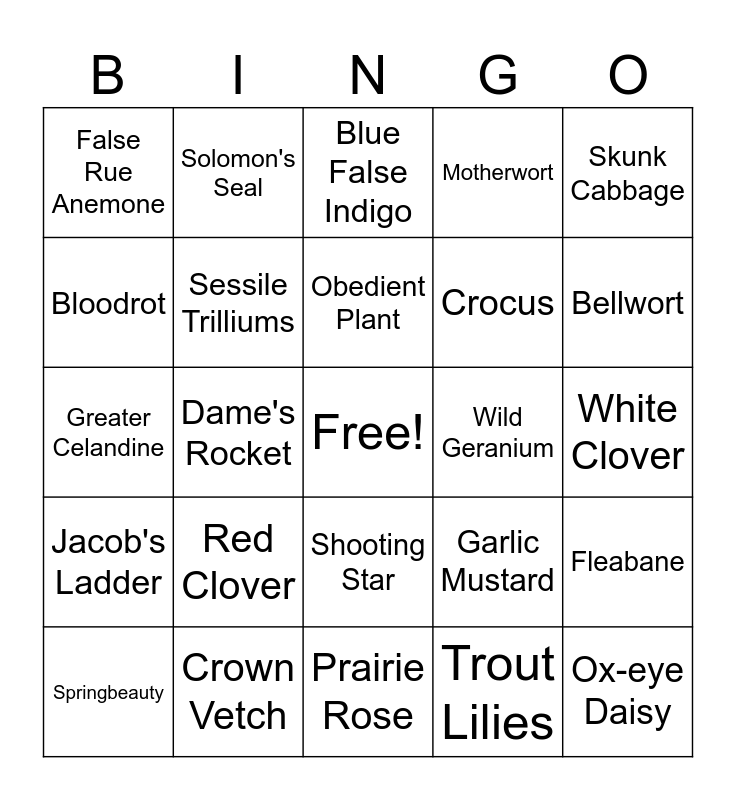 This bingo card has a free space and 71 words: Spiderwort, Solomon's Seal, Wild Columbine, White Campion, Prairie Rose, Canada Anemone, Motherwort, Lungwort, Crocus, Sharp-lobed Hepatica, Springbeauty, Jack-in-the-Pulpit, Bellwort, False Rue Anemone, Yellow Archangel, Greater Celandine, Garlic Mustard, Skunk Cabbage, Dandelion, White Clover, Red Clover, Ox-eye Daisy, Fleabane, Bird's Foot Trefoil, True Forget-Me-Not, White Avens, Creeping Bellflower, Michigan Lily, Tiger Lily, Day Lily, Crown Vetch, Heal-all, Tall Thimbleweed, Bergamont, Trout Lilies, Snowdrops, Siberian Squill, Purple Dead-nettle, Bloodrot, Dutchman's Breeches, Shooting Star, Fogglove Beardtongue, Jacob's Ladder, Wild Hyacinth, Virginia Bluebells, Cutlead Toothwort, Great White Trillium, Sessile Trilliums, Woodland Phlox, Wood Violets, Early Buttercup, Swamp Buttercup, Wild Geranium, Eastern Waterleaf, Mayapple, Lily of the Valley, Obedient Plant, Blue Flag Iris, Yellow Flag Iris, Impatiens Balfourii, Yellow Jewelweed, Spotted Jewelweed, Dame's Rocket, Yellow Garden Rocket, Golden Alexander, Creeping Charlie, Blue False Indigo, White Wild Indigo, False Solomon's Seal, Cow Parsnip and Glade Mallow.
