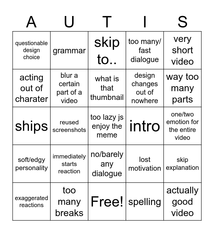 This bingo card has 25 words: soft/edgy personality, too many breaks, too lazy js enjoy the meme, spelling, very short video, questionable design choice, grammar, skip to.., intro, skip explanation, acting out of charater, blur a certain part of a video, Free!, lost motivation, way too many parts, exaggerated reactions, reused screenshots, what is that thumbnail, design changes out of nowhere, one/two emotion for the entire video, ships, immediately starts reaction, no/barely any dialogue, too many/ fast dialogue and actually good video.