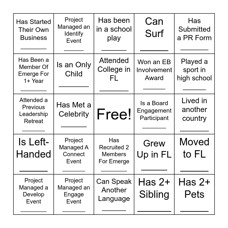 This bingo card has a free space and 24 words: Project Managed A Connect Event _______, Project Managed an Engage Event _______, Attended College in FL _______, Project Managed a Develop Event ________, Has Submitted a PR Form _______, Has Started Their Own Business _______, Has Been a Member Of Emerge For 1+ Year ________, Project Managed an Identify Event ______, Is a Board Engagement Participant _______, Has Recruited 2 Members For Emerge ________, Won an EB Involvement Award ______, Attended a Previous Leadership Retreat _______, Grew Up in FL _____, Moved to FL _____, Is an Only Child _______, Has 2+ Sibling ______, Lived in another country _______, Has been in a school play ______, Played a sport in high school ______, Has Met a Celebrity ______, Has 2+ Pets _____, Is Left-Handed _____, Can Surf _____ and Can Speak Another Language ______.