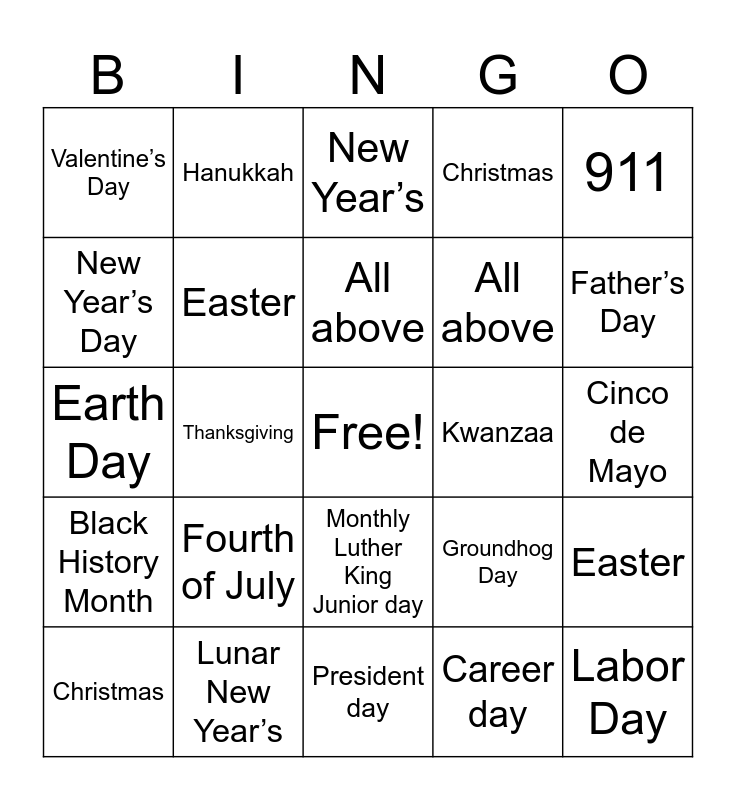 This bingo card has a free space and 29 words: Christmas, Halloween, Thanksgiving, Hanukkah, Valentine’s Day, New Year’s, Easter, Fourth of July, Kwanzaa, Lunar New Year’s, Cinco de Mayo, Labor Day, President day, Career day, Father’s Day, Mother’s Day, Monthly Luther King Junior day, Black History Month, 911, Earth Day, Groundhog Day, Birthday birthdays, All above, New Year’s Day, Christmas, Hanukkah, Easter, All above and Earth Day.