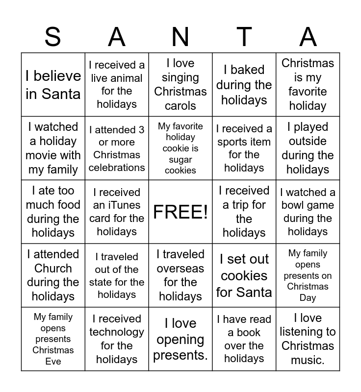 This bingo card has a free space and 24 words: I traveled out of the state for the holidays, I received technology for the holidays, My favorite holiday cookie is sugar cookies, My family opens presents Christmas Eve, Christmas is my favorite holiday, I believe in Santa, I watched a holiday movie with my family, I received a live animal for the holidays, I received a trip for the holidays, I traveled overseas for the holidays, I received a sports item for the holidays, I ate too much food during the holidays, I set out cookies for Santa, My family opens presents on Christmas Day, I attended 3 or more Christmas celebrations, I have read a book over the holidays, I watched a bowl game during the holidays, I love singing Christmas carols, I played outside during the holidays, I received an iTunes card for the holidays, I love listening to Christmas music., I attended Church during the holidays, I baked during the holidays and I love opening presents..