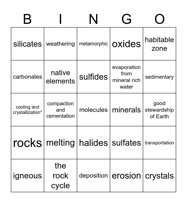 This bingo card has a free space and 24 words: igneous, melting, sulfides, erosion, habitable zone, silicates, weathering, metamorphic, minerals, good stewardship of Earth, cooling and crystallization*, native elements, sulfates, transportation, carbonates, the rock cycle, deposition, oxides, sedimentary, rocks, compaction and cementation, halides, evaporation from mineral rich water and crystals.
