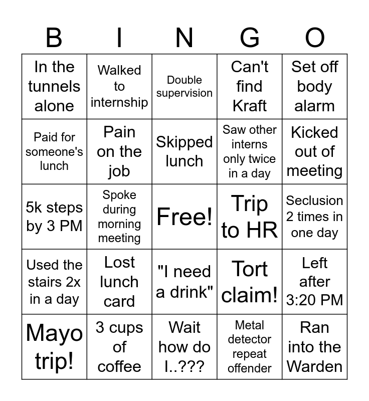This bingo card has a free space and 24 words: Mayo trip!, Lost lunch card, Skipped lunch, Metal detector repeat offender, Set off body alarm, In the tunnels alone, Walked to internship, Double supervision, Trip to HR, Seclusion 2 times in one day, 5k steps by 3 PM, Pain on the job, Tort claim!, Left after 3:20 PM, Paid for someone's lunch, 3 cups of coffee, Wait how do I..???, Can't find Kraft, Kicked out of meeting, Used the stairs 2x in a day, Spoke during morning meeting, "I need a drink", Saw other interns only twice in a day and Ran into the Warden.