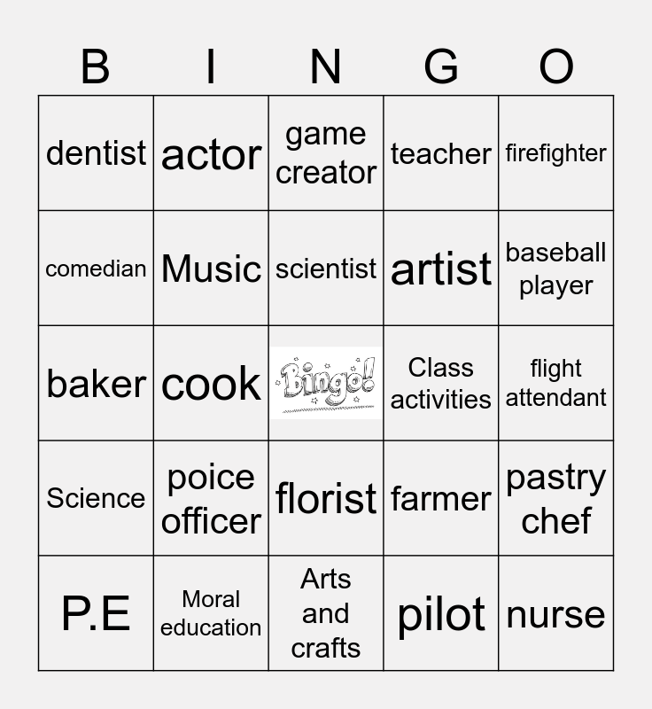 This bingo card has a free space and 42 words: zookeeper, scientist, programmer, poice officer, pilot, pastry chef, nurse, musician, game creator, florist, flight attendant, baseball player, cook, firefighter, figure skater, farmer, comic book artist, baker, astronaut, actor, comedian, doctor, designer, dentist, bus driver, carpenter, artist, English, Japanese, Calligraphy, math, Science, Music, Arts and crafts, Home economics, P.E, Moral education, Class activities, singer, soccer player, teacher and vet.