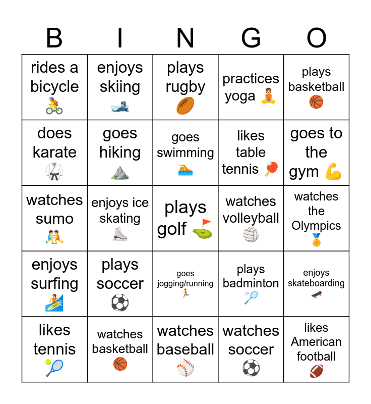 This bingo card has 25 words: plays soccer β½, watches baseball βΎ, goes swimming π, likes tennis πΎ, plays basketball π, rides a bicycle π΄, does karate π₯, enjoys skiing πΏ, watches volleyball π, goes jogging/running π, likes table tennis π, watches sumo π€Ό, plays badminton πΈ, enjoys skateboarding πΉ, goes hiking β°οΈ, likes American football π, watches the Olympics π , plays rugby π, goes to the gym πͺ, enjoys ice skating βΈοΈ, plays golf β³, watches basketball π, enjoys surfing π, practices yoga π§ and watches soccer β½.