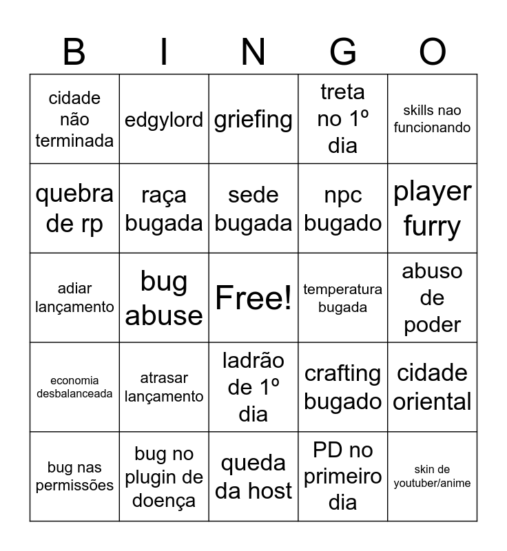 This bingo card has a free space and 24 words: atrasar lançamento, bug no plugin de doença, sede bugada, bug nas permissões, skills nao funcionando, cidade não terminada, quebra de rp, edgylord, temperatura bugada, ladrão de 1º dia, npc bugado, adiar lançamento, crafting bugado, cidade oriental, raça bugada, PD no primeiro dia, abuso de poder, griefing, player furry, bug abuse, skin de youtuber/anime, economia desbalanceada, treta no 1º dia and queda da host.