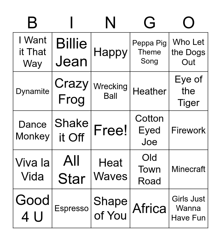 This bingo card has a free space and 29 words: Good 4 U, Bad Guy, Shake it Off, We Will Rock You, I Want it That Way, Happy, Crazy Frog, All Star, Cotton Eyed Joe, Espresso, Firework, Girls Just Wanna Have Fun, Shape of You, Africa, Eye of the Tiger, Macarena, Heat Waves, Viva la Vida, Who Let the Dogs Out, Dance Monkey, Old Town Road, Apt, Heather, Dynamite, Peppa Pig Theme Song, Billie Jean, Minecraft, Wrecking Ball and Shallow.