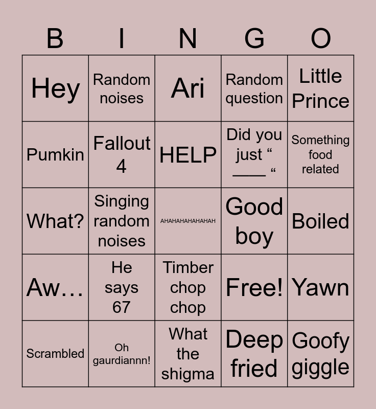This bingo card has 25 words: He says 67, What the shigma, HELP, Scrambled, Little Prince, Hey, Pumkin, Random noises, Good boy, Timber chop chop, Did you just “ —— “, What?, Free!, Yawn, Fallout 4, Goofy giggle, Boiled, Ari, Something food related, Singing random noises, AHAHAHAHAHAHAH, Oh gaurdiannn!, Aw…, Random question and Deep fried.