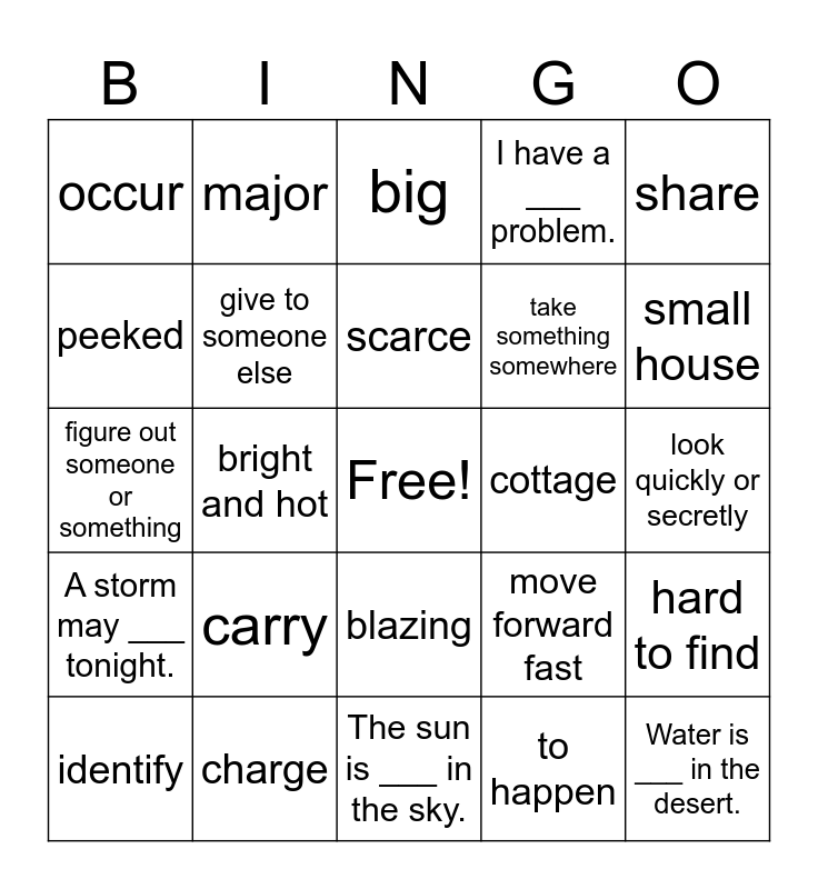 This bingo card has a free space and 24 words: carry, charge, scarce, identify, share, occur, peeked, major, cottage, blazing, take something somewhere, figure out someone or something, move forward fast, hard to find, give to someone else, to happen, look quickly or secretly, big, small house, bright and hot, Water is ___ in the desert., A storm may ___ tonight., I have a ___ problem. and The sun is ___ in the sky..