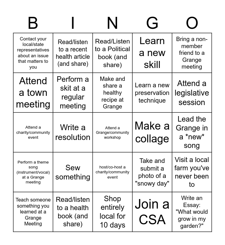 This bingo card has 39 words: Free!, Participate in a book club, Plant 3 native plants, Perform a skit at a regular meeting, Teach someone something you learned at a Grange Meeting, host/co-host a charity/community event, Make and share a healthy recipe at Grange, Take and submit a photo of "farmers at work", Bring a non-member friend to a Grange meeting, Perform a theme song (instrument/vocal) at a Grange meeting, Write a resolution, Learn a new skill, Attend a Grange/community workshop, Lead the Grange in a *new* song, Make a collage, Sew something, Volunteer in the community, Contact your local/state representatives about an issue that matters to you, Participate in a bird counting program, Take and submit a photo of a "snowy day", Attend a town meeting, Shop entirely local for 10 days, Learn a new preservation technique, Attend a legislative session, Talk to a farmer about joining Grange, Read/listen to a book on farming, Write an Essay: "What would grow in my garden?", Give a homemade gift, Share Grange policy with 3 non-members, Read/listen to a recent health article (and share), Attend/assist in a youth event, Attend a music event, Read/Listen to a Political book (and share), Read/listen to a health book (and share), Join a CSA, Raise/Grow something for at least 1 month and why, Visit a local farm you've never been to, Attend a charity/community event and Write a newspaper article about a Grange/community event.