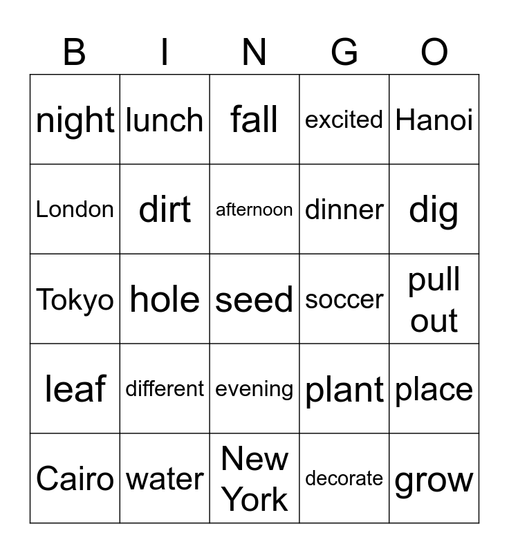 This bingo card has 25 words: different, New York, afternoon, Cairo, Hanoi, night, London, lunch, soccer, evening, dinner, Tokyo, plant, place, dirt, grow, pull out, fall, dig, hole, seed, water, leaf, excited and decorate.