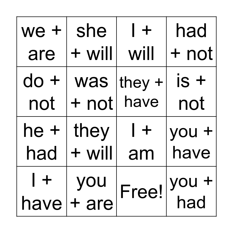This bingo card has 17 words: Free!, I + have, I + will, we + are, they + will, had + not, you + have, they + have, is + not, was + not, you + are, I + am, do + not, she + will, he + had, did + not and you + had.