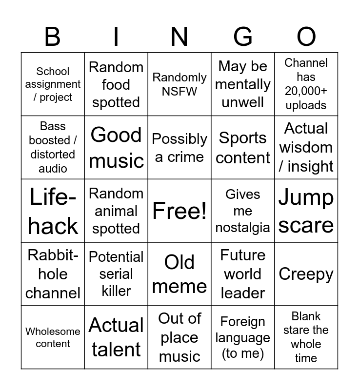 This bingo card has a free space and 24 words: Potential serial killer, Actual talent, Possibly a crime, Wholesome content, Channel has 20,000+ uploads, School assignment / project, Bass boosted / distorted audio, Random food spotted, Gives me nostalgia, Old meme, Sports content, Life- hack, Future world leader, Creepy, Good music, Foreign language (to me), Jump scare, Randomly NSFW, Actual wisdom / insight, Random animal spotted, Blank stare the whole time, Rabbit-hole channel, May be mentally unwell and Out of place music.