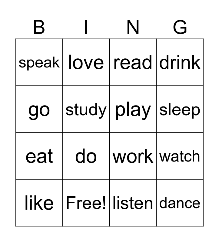 This bingo card has 21 words: Free!, buy, love, write, listen, play, speak, read, work, sleep, eat, drink, dance, run, study, sing, like, do, go, watch and cook.