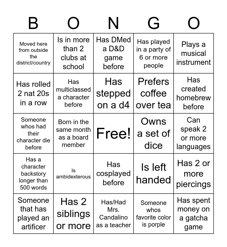 This bingo card has a free space and 24 words: Is ambidexterous, Has 2 siblings or more, Has stepped on a d4, Someone that has played an artificer, Plays a musical instrument, Moved here from outside the district/country, Has rolled 2 nat 20s in a row, Is in more than 2 clubs at school, Owns a set of dice, Has cosplayed before, Prefers coffee over tea, Someone whos had their character die before, Is left handed, Has 2 or more piercings, Has multiclassed a character before, Someone whos favorite color is porple, Can speak 2 or more languages, Has DMed a D&D game before, Has created homebrew before, Born in the same month as a board member, Has spent money on a gatcha game, Has a character backstory longer than 500 words, Has played in a party of 6 or more people and Has/Had Mrs. Candalino as a teacher.