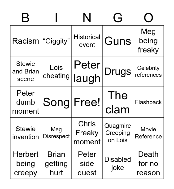 This bingo card has a free space and 24 words: Meg Disrespect, Brian getting hurt, Peter laugh, Herbert being creepy, Meg being freaky, Racism, Stewie and Brian scene, “Giggity”, The clam, Chris Freaky moment, Drugs, Peter dumb moment, Quagmire Creeping on Lois, Movie Reference, Lois cheating, Disabled joke, Flashback, Historical event, Celebrity references, Song, Death for no reason, Stewie invention, Guns and Peter side quest.