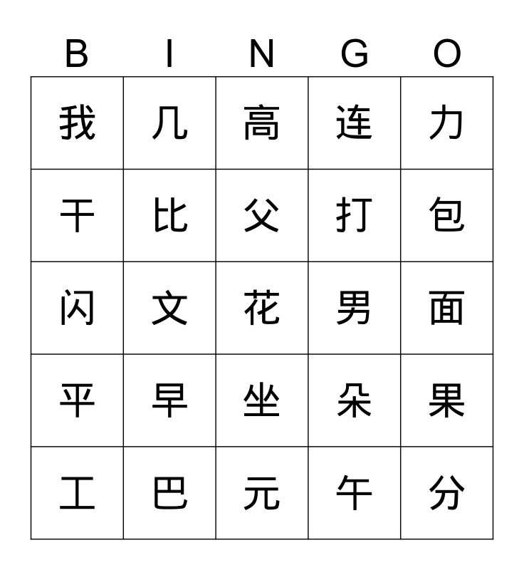 This bingo card has a free space and 24 words: 早, 巴, 父, 工, 力, 我, 干, 几, 男, 坐, 打, 闪, 朵, 果, 比, 午, 面, 高, 包, 文, 分, 平, 连 and 元.