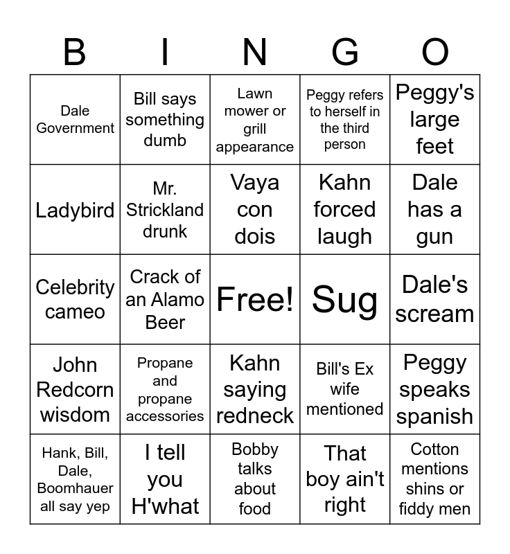 This bingo card has a free space and 24 words: Propane and propane accessories, I tell you H'what, Vaya con dois, Hank, Bill, Dale, Boomhauer all say yep, Peggy's large feet, Dale Government, Ladybird, Bill says something dumb, Sug, Kahn saying redneck, Kahn forced laugh, Celebrity cameo, Bill's Ex wife mentioned, Peggy speaks spanish, Mr. Strickland drunk, That boy ain't right, Dale's scream, Lawn mower or grill appearance, Dale has a gun, Crack of an Alamo Beer, Cotton mentions shins or fiddy men, John Redcorn wisdom, Peggy refers to herself in the third person and Bobby talks about food.