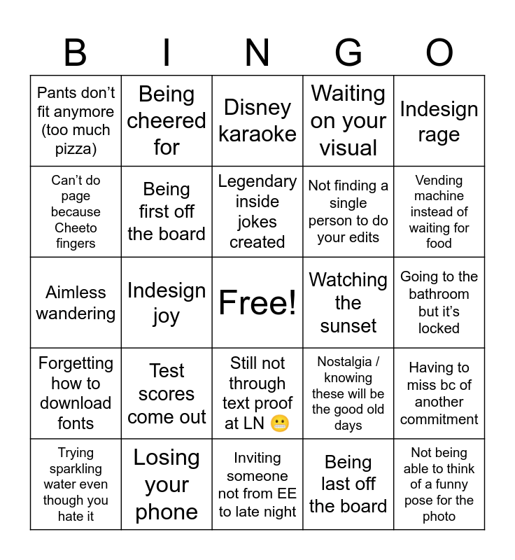 This bingo card has a free space and 24 words: Test scores come out, Losing your phone, Legendary inside jokes created, Trying sparkling water even though you hate it, Indesign rage, Pants don’t fit anymore (too much pizza), Can’t do page because Cheeto fingers, Being cheered for, Watching the sunset, Still not through text proof at LN 😬, Not finding a single person to do your edits, Aimless wandering, Nostalgia / knowing these will be the good old days, Having to miss bc of another commitment, Being first off the board, Being last off the board, Going to the bathroom but it’s locked, Disney karaoke, Vending machine instead of waiting for food, Indesign joy, Not being able to think of a funny pose for the photo, Forgetting how to download fonts, Waiting on your visual and Inviting someone not from EE to late night.
