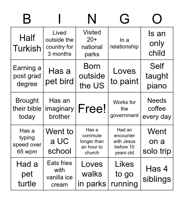 This bingo card has a free space and 24 words: Went to a UC school, Eats fries with vanilla ice cream, Born outside the US, Had a pet turtle, Is an only child, Half Turkish, Earning a post grad degree, Lived outside the country for 3 months, Works for the government, Has a commute longer than an hour to church, Loves to paint, Brought their bible today, Had an encounter with Jesus before 10 years old, Went on a solo trip, Has a pet bird, Likes to go running, Needs coffee every day, Visited 20+ national parks, Self taught piano, Has an imaginary brother, Has 4 siblings, Has a typing speed over 65 wpm, In a relationship and Loves walks in parks.