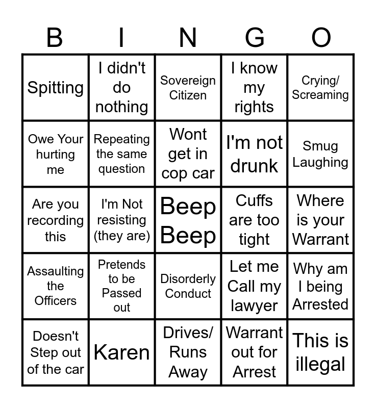 This bingo card has a free space and 24 words: Doesn't Step out of the car, Pretends to be Passed out, Wont get in cop car, Warrant out for Arrest, Crying/ Screaming, Spitting, I didn't do nothing, Sovereign Citizen, Cuffs are too tight, Where is your Warrant, Are you recording this, Repeating the same question, Let me Call my lawyer, Why am I being Arrested, Owe Your hurting me, Karen, Drives/ Runs Away, I know my rights, Smug Laughing, Assaulting the Officers, I'm Not resisting (they are), Disorderly Conduct, I'm not drunk and This is illegal.