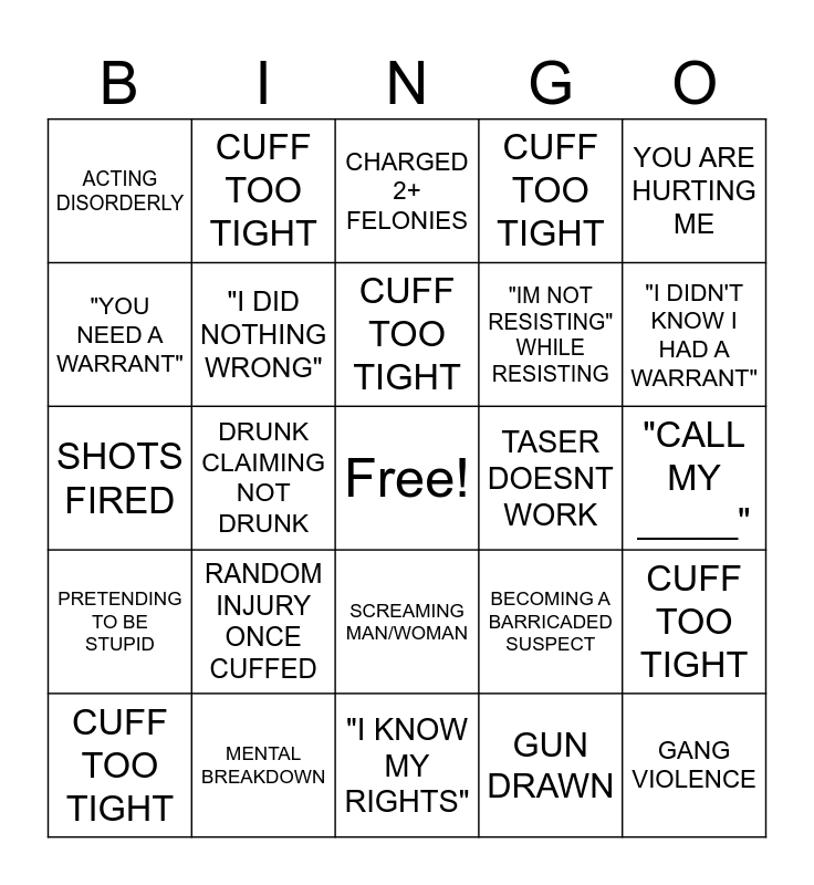 This bingo card has a free space and 29 words: CUFF TOO TIGHT, REGRETTING ACTIONS, DRUNK CLAIMING NOT DRUNK, KICKING WHILE IN COPCAR CUFFED, ACTING DISORDERLY, CHARGED 2+ FELONIES, "I DID NOTHING WRONG", RANDOM INJURY ONCE CUFFED, TASER DOESNT WORK, MENTAL BREAKDOWN, "CALL MY _____", GANG VIOLENCE, "I KNOW MY RIGHTS", GUN DRAWN, "I DIDN'T KNOW I HAD A WARRANT", "IM GOING TO MACE/TASE YOU", SCREAMING MAN/WOMAN, PRETENDING TO BE STUPID, YOU ARE HURTING ME, SHOTS FIRED, BECOMING A BARRICADED SUSPECT, CAR CRASH, "IM NOT RESISTING" WHILE RESISTING, "YOU NEED A WARRANT", CUFF TOO TIGHT, CUFF TOO TIGHT, CUFF TOO TIGHT, CUFF TOO TIGHT and CUFF TOO TIGHT.