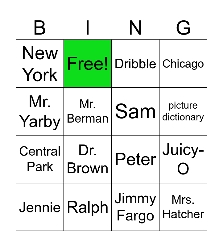 This bingo card has 19 words: Peter, Fudge, Dribble, Mrs. Hatcher, Juicy-O, Mr. Yarby, Jimmy Fargo, New York, Free!, Central Park, Dr. Brown, Mr. Berman, Sam, Ralph, Jennie, Fang, Chicago, picture dictionary and loafers.