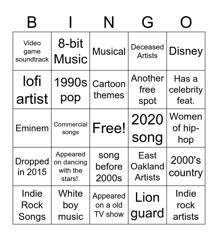 This bingo card has a free space and 24 words: Appeared on dancing with the stars!., White boy music, Cartoon themes, Indie Rock Songs, Disney, Video game soundtrack, lofi artist, 8-bit Music, 2020 song, song before 2000s, Another free spot, Eminem, East Oakland Artists, 2000's country, 1990s pop, Lion guard, Women of hip-hop, Musical, Has a celebrity feat., Commercial songs, Indie rock artists, Dropped in 2015, Deceased Artists and Appeared on a old TV show.
