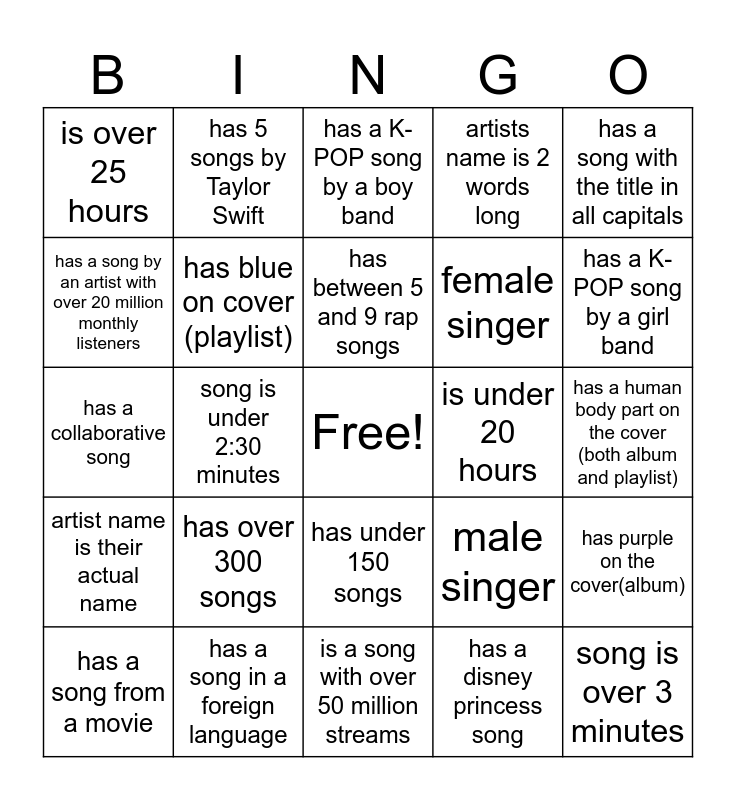 This bingo card has a free space and 24 words: has over 300 songs, has a song in a foreign language, has between 5 and 9 rap songs, has a song from a movie, has a song with the title in all capitals, is over 25 hours, has a song by an artist with over 20 million monthly listeners, has 5 songs by Taylor Swift, is under 20 hours, has under 150 songs, female singer, has a collaborative song, male singer, has purple on the cover(album), has blue on cover (playlist), has a disney princess song, has a human body part on the cover (both album and playlist), has a K-POP song by a boy band, has a K-POP song by a girl band, song is under 2:30 minutes, song is over 3 minutes, artist name is their actual name, artists name is 2 words long and is a song with over 50 million streams.