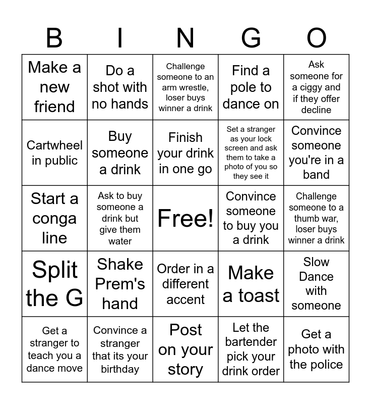 This bingo card has a free space and 24 words: Shake Prem's hand, Convince a stranger that its your birthday, Finish your drink in one go, Get a stranger to teach you a dance move, Ask someone for a ciggy and if they offer decline, Make a new friend, Cartwheel in public, Do a shot with no hands, Convince someone to buy you a drink, Order in a different accent, Set a stranger as your lock screen and ask them to take a photo of you so they see it, Start a conga line, Make a toast, Slow Dance with someone, Buy someone a drink, Let the bartender pick your drink order, Challenge someone to a thumb war, loser buys winner a drink, Challenge someone to an arm wrestle, loser buys winner a drink, Convince someone you're in a band, Ask to buy someone a drink but give them water, Get a photo with the police, Split the G, Find a pole to dance on and Post on your story.