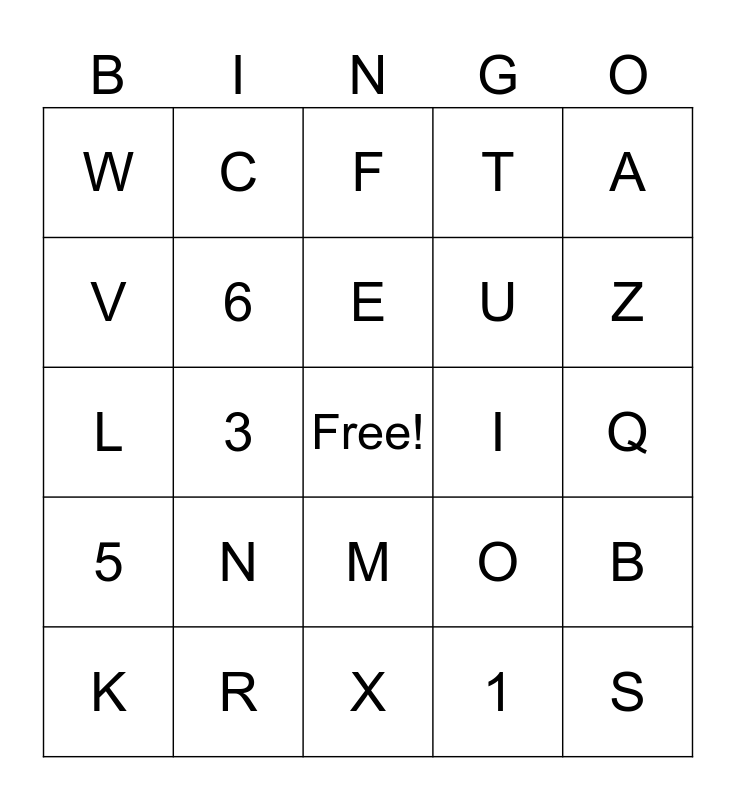 This bingo card has a free space and 32 words: 1, 2, 3, 4, 5, 6, A, B, C, D, E, F, G, H, I, J, K, L, M, N, O, P, Q, R, S, T, U, V, W, X, Y and Z.